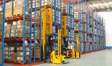 此類倉庫中,低、高位倉庫大多用前移式電瓶叉車、平衡重電瓶叉車、三向叉車進(jìn)行存取作業(yè),貨架較矮時也可用電動堆高機(jī),超高位倉庫用堆垛機(jī)進(jìn)行存取作
